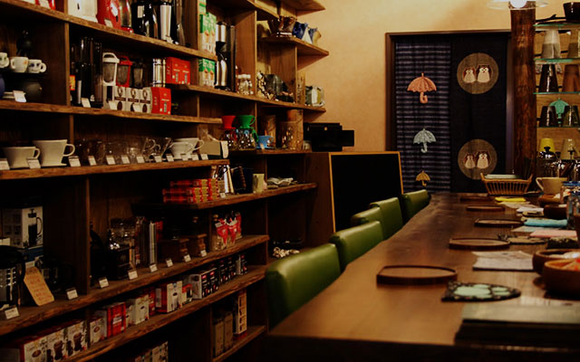 試飲用のカウンター席が特徴。実際に飲み比べながら豆を選ぶことができます。壁一面にコーヒーグッズや、味わいのあるコーヒーカップなどもあり、視覚的にも楽しめる店内となっています。