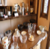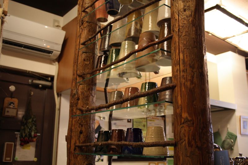 たくさんの種類のコーヒーポットやカップもあります。 また、コーヒー用のいろりと流木の棚もご用意しました。